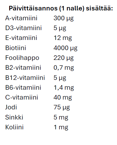 Biotiini yhdessä sinkin ja jodin kanssa lisää hiusten vahvuutta, ihon loistoa ja kynsien kestävyyttä. A-, C- ja E-vitamiinit yhdessä sinkin kanssa auttavat suojaamaan soluja oksidatiiviselta stressiltä, samalla kun B-vitamiinit ja foolihappo tukevat energian tuotantoa, hermoston toimintaa ja hormonaalista tasapainoa. D3- ja B12-vitamiineilla on tärkeä rooli solujen jakautumisprosessissa ja ne edistävät immuunijärjestelmän toimintaa.