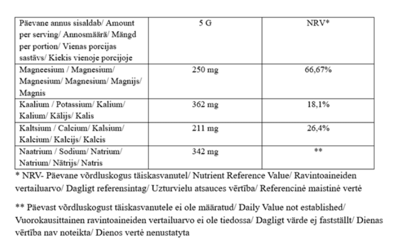 Suositeltua päiväannosta ei saa ylittää. Ei sovellu lapsille, raskaana oleville tai imettäville. Säilytä lasten ulottumattomissa. Keskustele lääkärin kanssa, jos sinulla on jokin sairaus tai käytät lääkkeitä. Ravintolisää ei ole tarkoitettu monipuolisen ruokavalion korvaamiseksi. On tärkeää syödä monipuolisesti ja tasapainoisesti sekä ylläpitää terveellistä elämäntapaa.