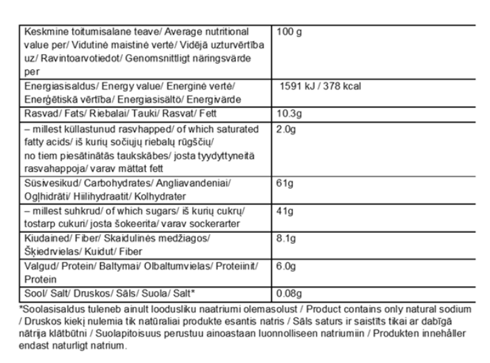 Säilytä kuivassa, huoneenlämmössä ja poissa suorasta auringonvalosta. Tuote saattaa sisältää pähkinähiukkasia.